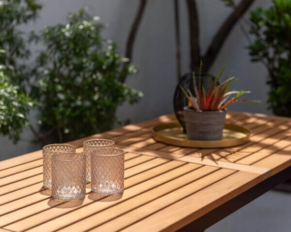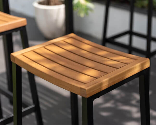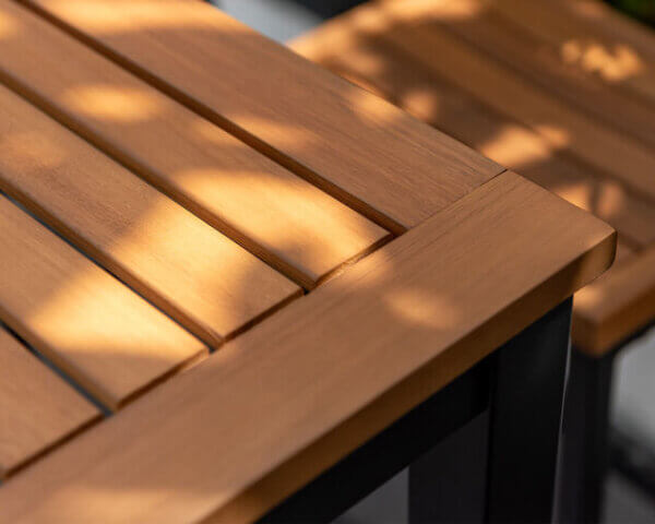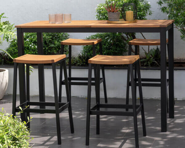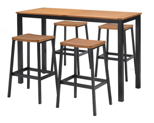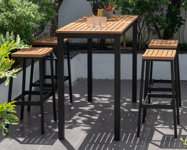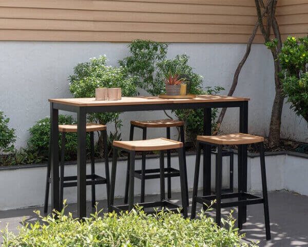 הבר מגיע בגימור של עץ אקליפטוס עמיד מאוד לתנאי חוץ וניתן לאפסן את הכיסאות מתחת לדלפק בזמן שאין שימוש כדי לחסוך במקום.